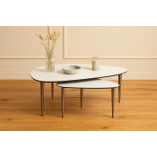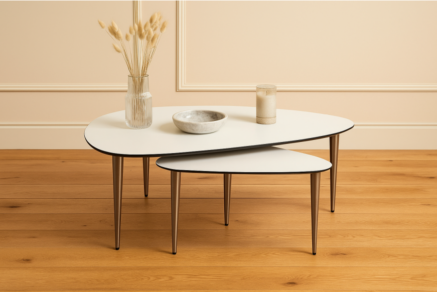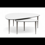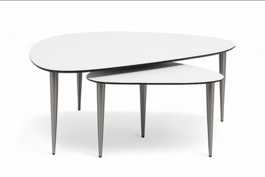 Design dit eget sofabord. Trekantede sofaborde 42 x 67 cm. / 89 x 126 cm. Hvid laminat med børstet stålben. Sætpris: