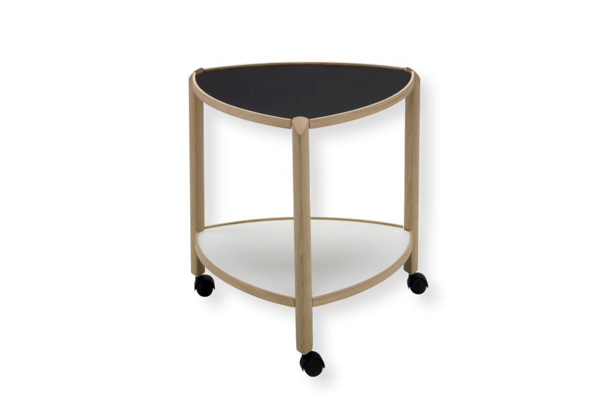 Klassisk dansk produceret bakkebord på hjul. I eg natur og med vendbar melamin plade.