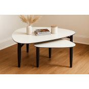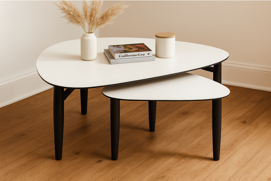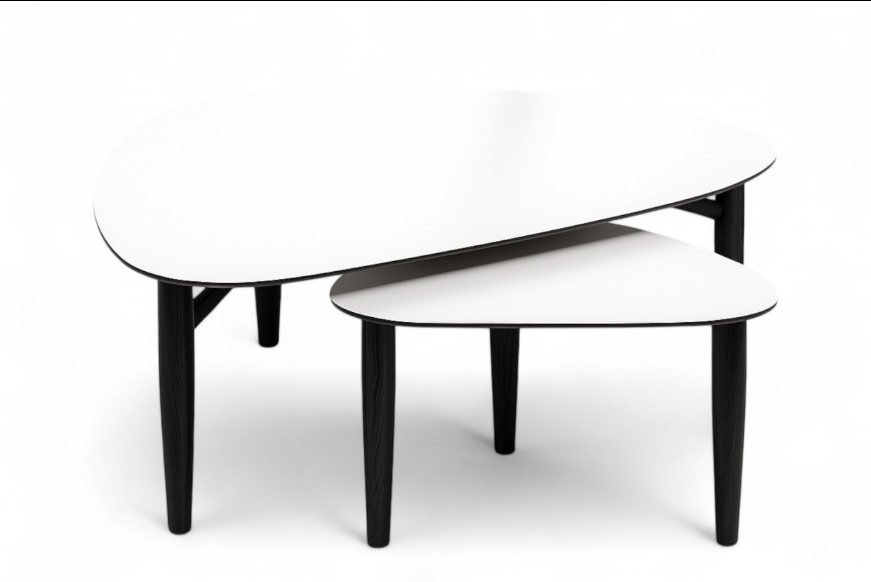 Design dit eget sofabord. Trekantede sofaborde 42 x 67 cm. / 89 x 126 cm. Hvid laminat laminat med sorte træben. Sætpris:
