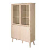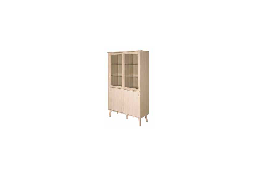 Øverst forefindes der 2 glasskydelåger med 4 justerbare glashylder bag. Nederst i vitrinen er der 2 skydelåger i træ med 2 træhylder bag, der ligeledes kan justeres.